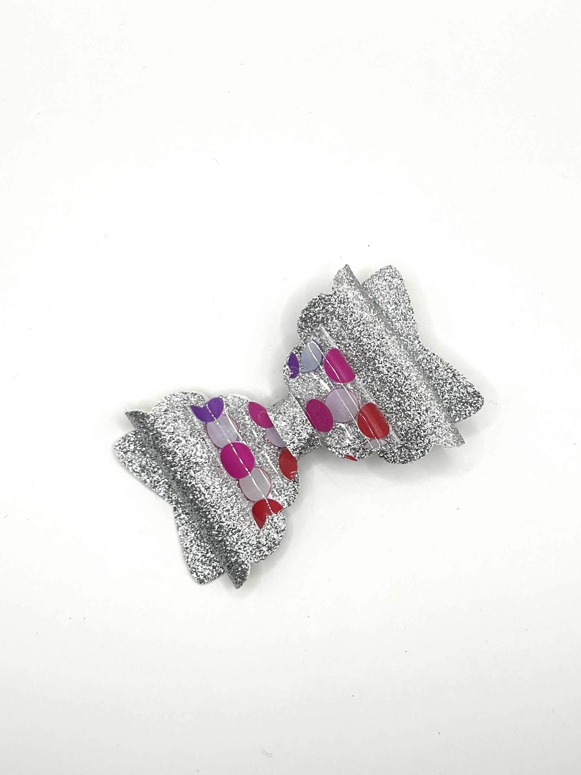 Multicoloured Polka Dots & Silver Glitter - Please note the bow will look like the image however the polka dots will be at random and colours of Polka Dots will include Red, Orange, Pink, Yellow, Blue & Purple